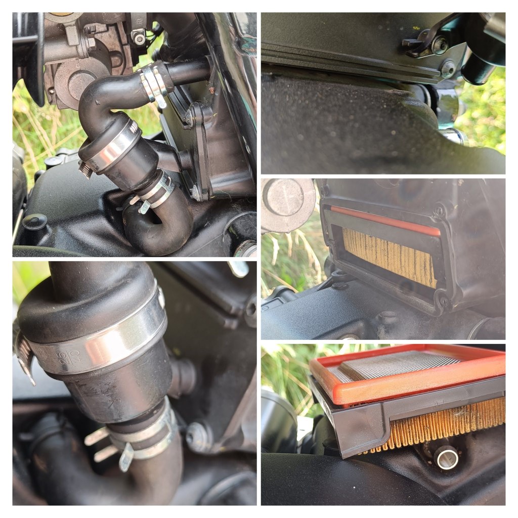 Første hindring. Finner ikke først bits som er stor nok for tappeskruen. Men fant en til slutt. Skralle. Nei – alt for stor – ikke den da. Men hva med… ok finner en som passer. Starter MC’en først – deretter la den stå litt slik at jeg ikke brenner meg på oljen. Får tømt oljen. Da var oljefilteret sin tur. HVA!? Oljefilteravdrageren passer ikke – får ikke skrudd den av. Ringer kona: “Kan du kjøre innom Thansen og kjøpe? – Sender deg bilde.” Dette vil jo ta en en stund. Hva kan jeg gjøre imens? Skifte luftfilteret! Ny runde med Youtube og brukermanualen. Ser jo lett ut det… Setter igang. Hva slags bits trenger jeg her da? Ny runde i boden. Etter en stund finner jeg en som passer. Men verktøyet for langt – kommer ikke til! Bruker fantasien og får mekket sammen en blanding av skralle og bits. Trenger en tang også. Begynner på nytt. Faen…! Ser jo ingen ting!